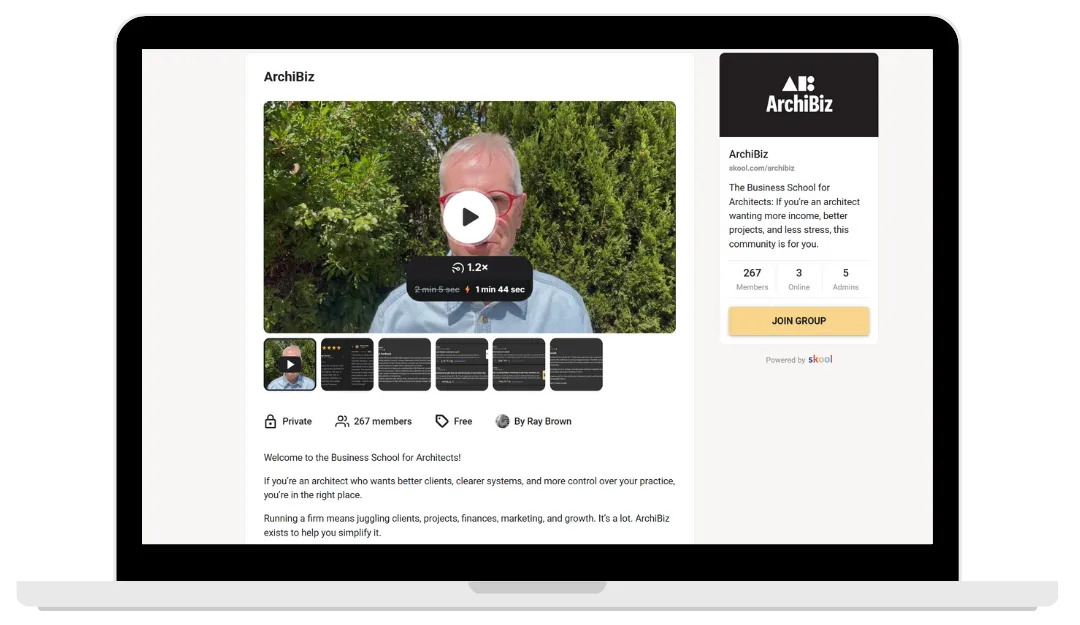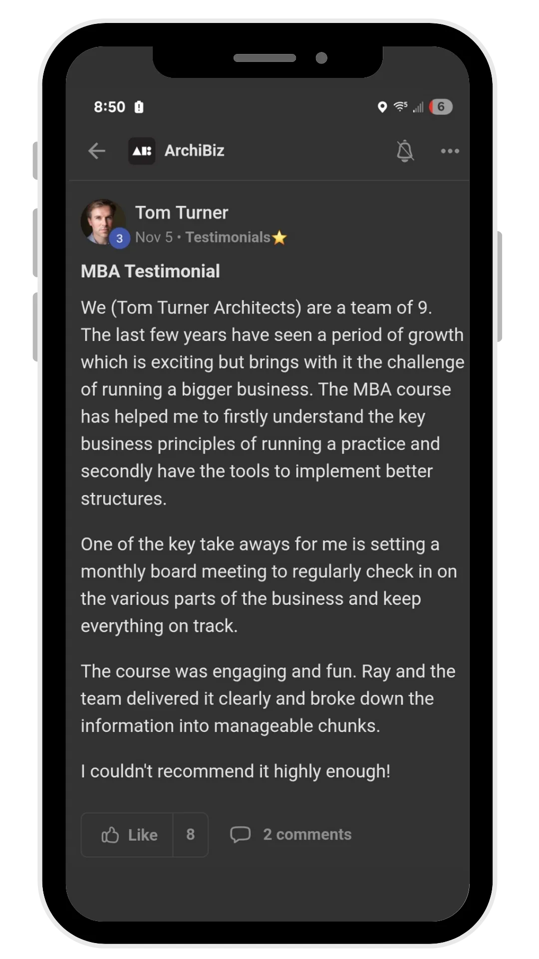 I can highly recommend the Archibiz MBA program to any architect running their own practice (I run a four-person studio based in France). Enrolling in the MBA allowed me to step up my understanding of the financial, commercial, and marketing dimensions of my practice. The live weekly sessions, delivered over an intensive eight-week period, provided a clear rhythm that helped me deepen my understanding step by step and apply the program’s key insights directly to my business. It’s a truly transformative experience that brings clarity, structure, and confidence to architects who want to strengthen the foundations of their studio and lead it with greater strategic intent.